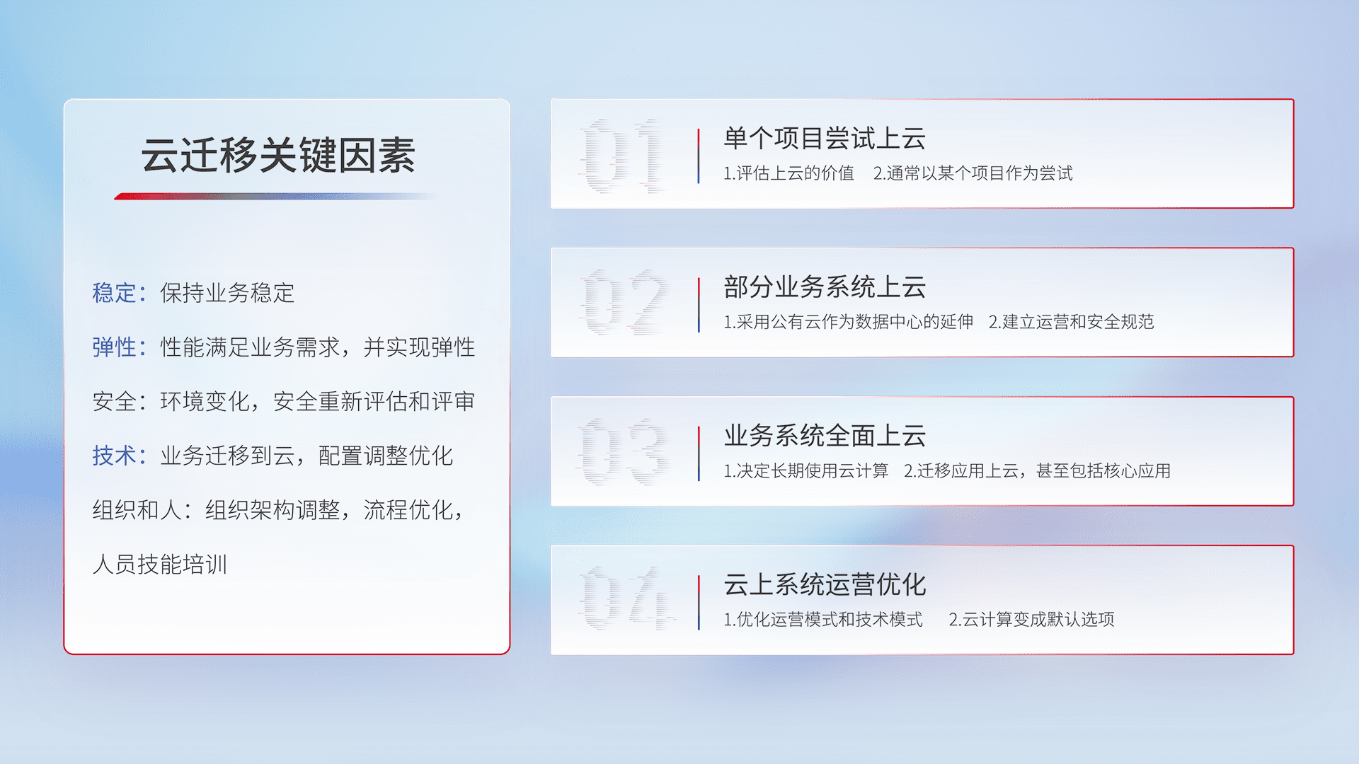 结合实际业务,,,从规划设计、、、云平台选型、、、、云原生改造、、、、数据迁移、、、、集成交付,,迁移全过程为客户识别最佳上云路径,,,,做好风险识别管理,,设计网络架构、、、身份权限、、安全审计合规、、、操作审计、、日志审计、、监控告警策略、、多站点容灾设计等,,对云上基础设施进行整体规划,,提升IT治理水平,,以满足弹性、、、高可用、、、、高性能的需求。。