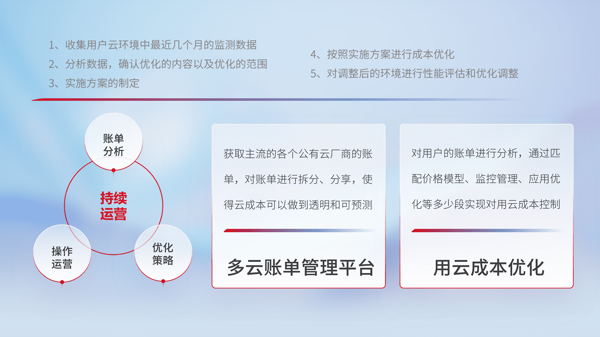 通过多云纳管,,以统一的资源数据模型把客户的云资源进行抽象和封装,,进而实现对多云资源的统一操作,,保障云资源管理的可靠性、、、稳定性与可用性。。量身定制化运维内容,,,,配置、、、开发运维、、、、补丁管理、、、备份、、、、监控、、、、认证和访问管理、、审计和日常巡检等,,,,保障在用云过程中的可靠度,,,稳定度以及高可用率。。