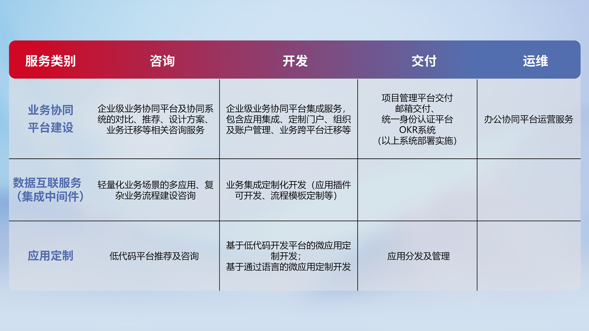 针对钉钉、、、企微、、IDaas等平台级产品提供产品的规划、、方案、、交付、、、定制化开发等服务,,,实现如统一协同办公、、智能客户服务、、混合会议管理、、智能数据查询、、、、等业务场景,,,实现数字化转型。。。